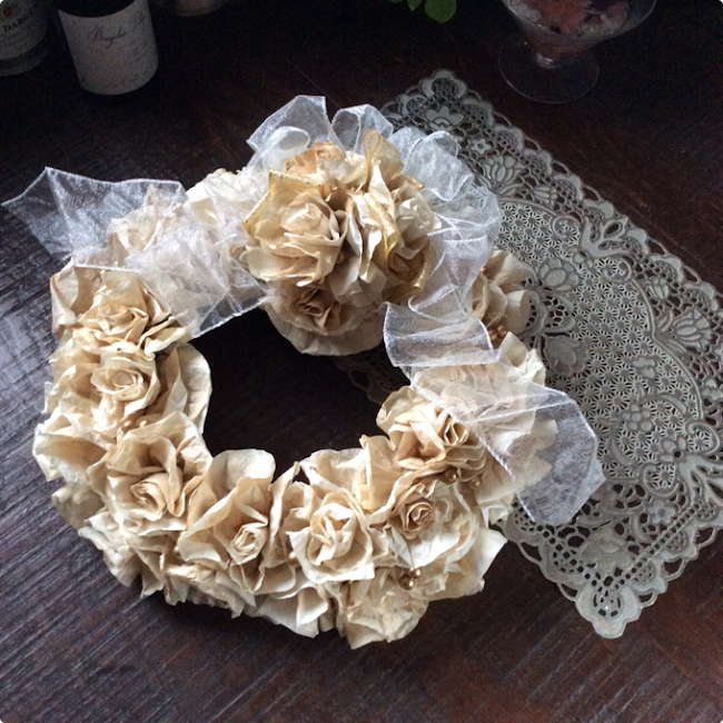 早いもので、1年の総仕上げをする季節が始まりました。やらなければならないことが多いうえに、次々と用事が入るのはいつものことですが、自宅のリースを作りましたよ。大好きな珈琲のフィルターをこつこつ貯めておいたもので薔薇を作り、ナチュラルな感じのリースに仕上がりました。毎朝の楽しみが重なってできたリースです。